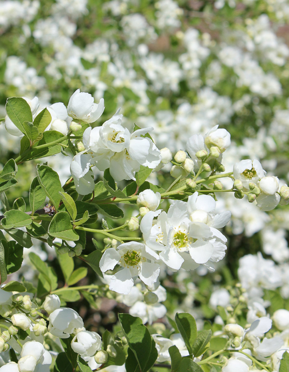 Pearl Bush, Exochordax Snow Day® 'Blizzard' has white flowers in the spring. It's an easy-to-grow shrub that flowers on the previous year's growth. This shrub has much larger flowers than the older variety 'The Bride'. Prune to keep it small. Full sun. Height: 60-72 inches, Spread: 60-72 inches. USDA zones: 4-8.