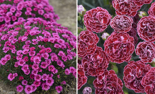 Dianthus hybrid, Fruit Punch®'Cherry Vanilla' has double deep red flowers on a low mound of blue-green foliage. Continuous bloomer that has a spicy fragrance. Full sun. Height: 8-10 inches, Spread: 8-12 inches. USDA zones: 4-9.