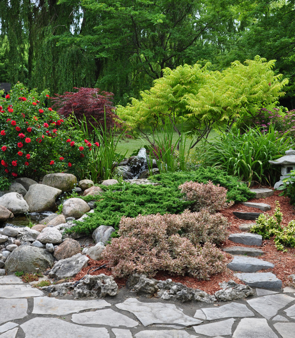 Variegated Weiglia and ground cover evergreens are planted alongside the path that leads to the top of the waterfall.