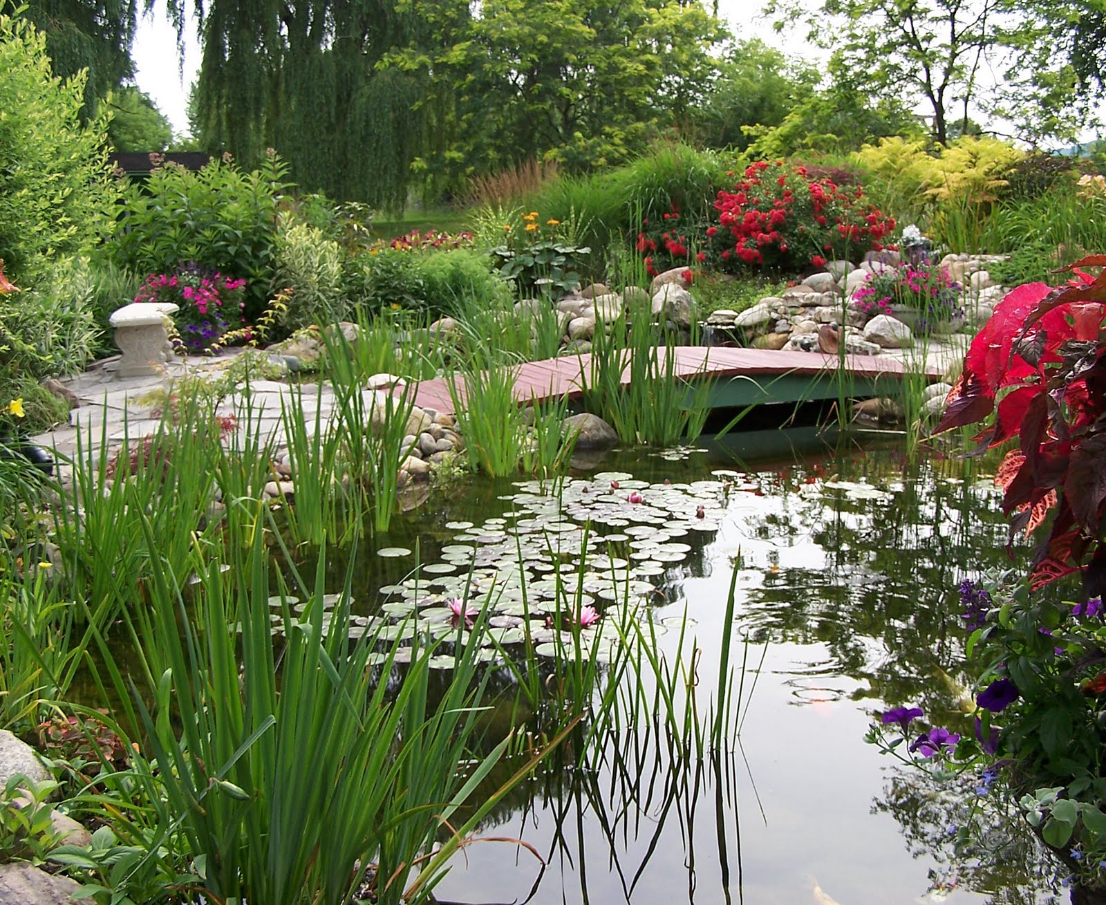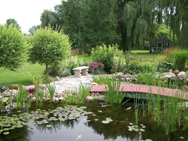 The three year old pond was one of the first projects that she and her husband tackled. An old swimming pool located just off the back deck was transformed into a large figure eight shaped pond. A japanese style wooden bridge crosses the pond at the narrowest point and links the two sections of the pond.