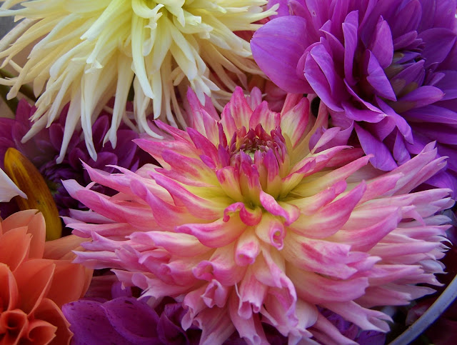 Starting in late July, there is a veritable rainbow of gorgeous dahlias at my local farmer's market.
