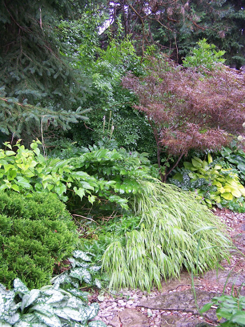 Hakone grass (Hakonechloa macra 'aureloa') in the foreground. Display garden at Lost Horizon Nursery, Acton, Ontario