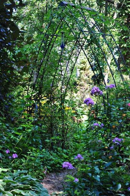 The cool shade of the tall pine and evergreen furs was more than welcome on that hot, humid afternoon. I loved the way that the "garden" perennials blended into the mix of native plants already found in the natural landscape.