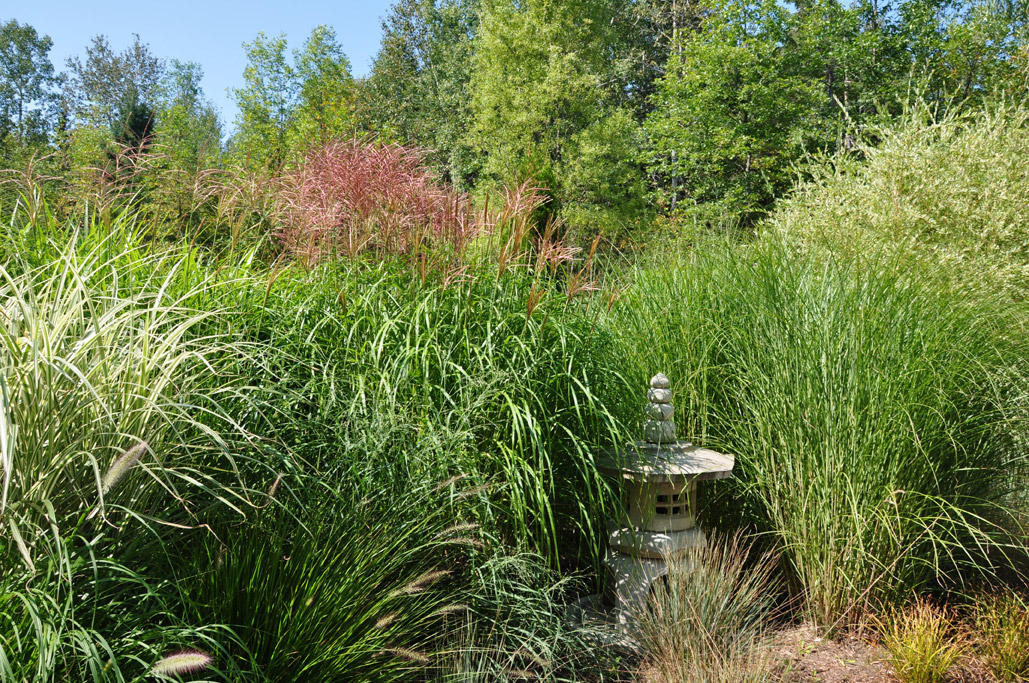 Different varieties of grasses were grouped beautifully in a garden beds. The spare inclusion of a Japanese ornament here and there were a great compliment to these minimal, all green displays.