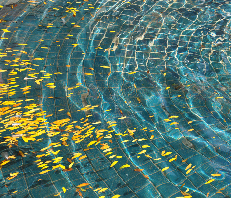 Yellow leaves float on the water. Fountain at the Kensington Flea Market, Toronto, Ontario.