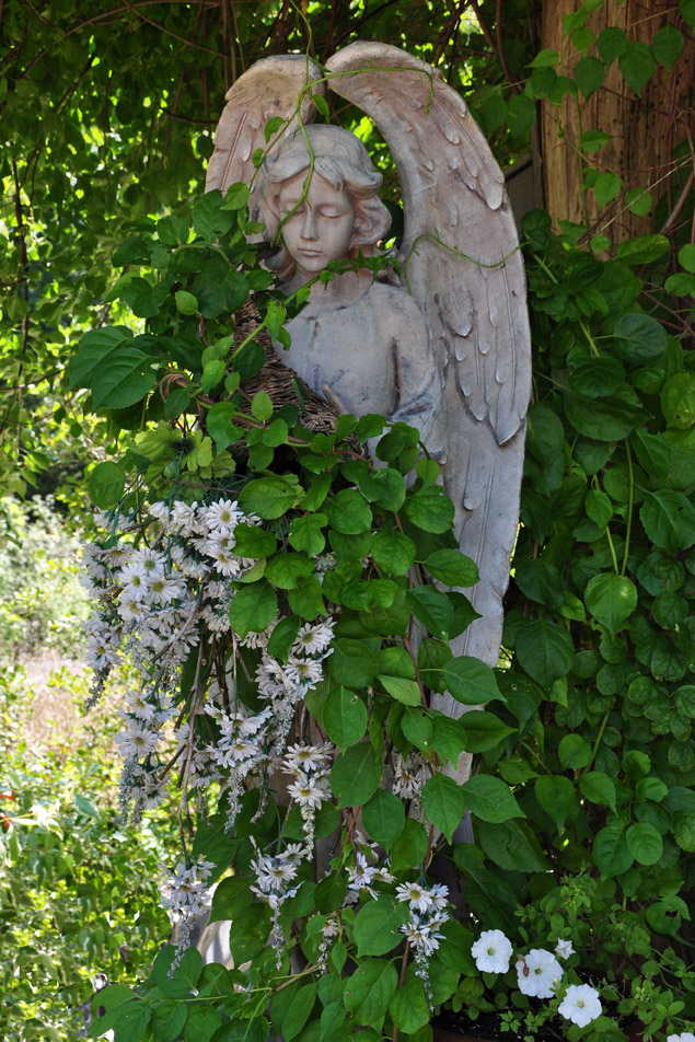 An angel in my neighbor's front garden. The vines are real, but the daises are not.