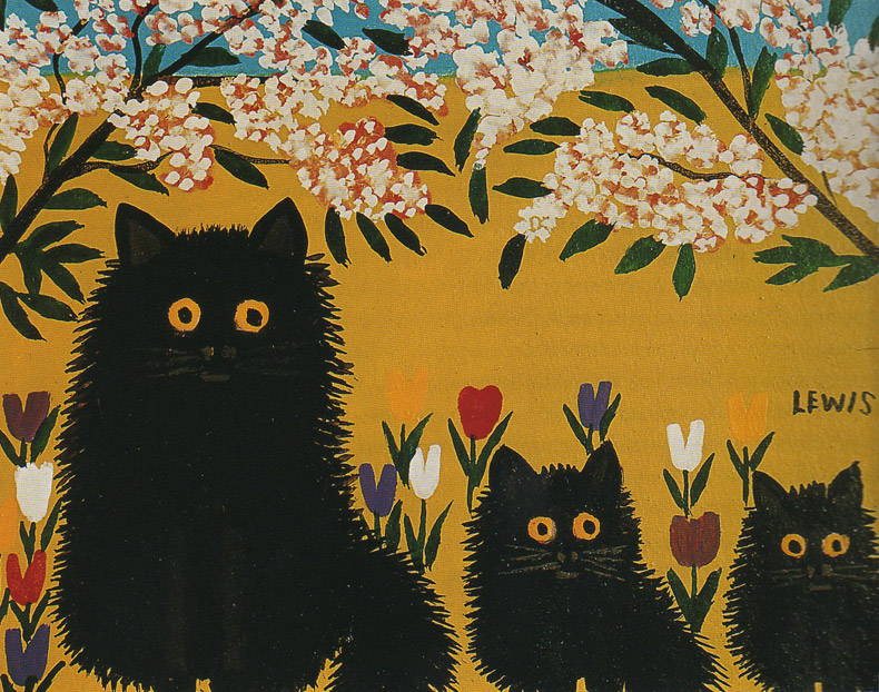 Maud began each painting with a pencil sketch and then filled in the shapes with quick strokes, one hand supporting the other hand that held the paint brush. She painted the same scenes again and again like favourite songs: a yoked pair of oxen, horse drawn carriages, cats, birds and flowers. What is so lovable about her crude style is the bright colors and the underlying humour.