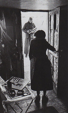 Evertt gathers firewood for the stove, while Maud watches from the doorway.