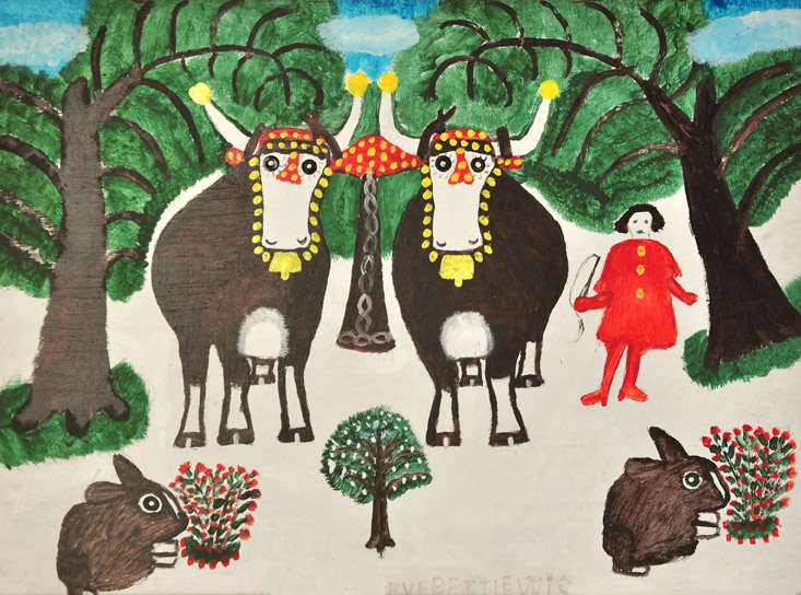 Evertt lived on another 11 years after Maud's death. During that time he became increasingly eccentric and suspicious of the world around him. Apart from his old age pension, the painting Maude did before her death were Evertt's only source of income. When the last of her paintings had been sold, Evertt began to paint his own artwork. The painting of the two oxen was one such creative endeavour.