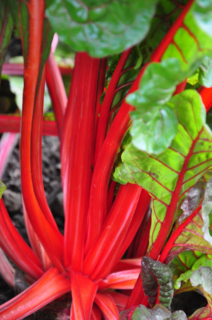 Crazy red Swiss Chard growing in a vegetable plot at Edwards Garden Toronto.