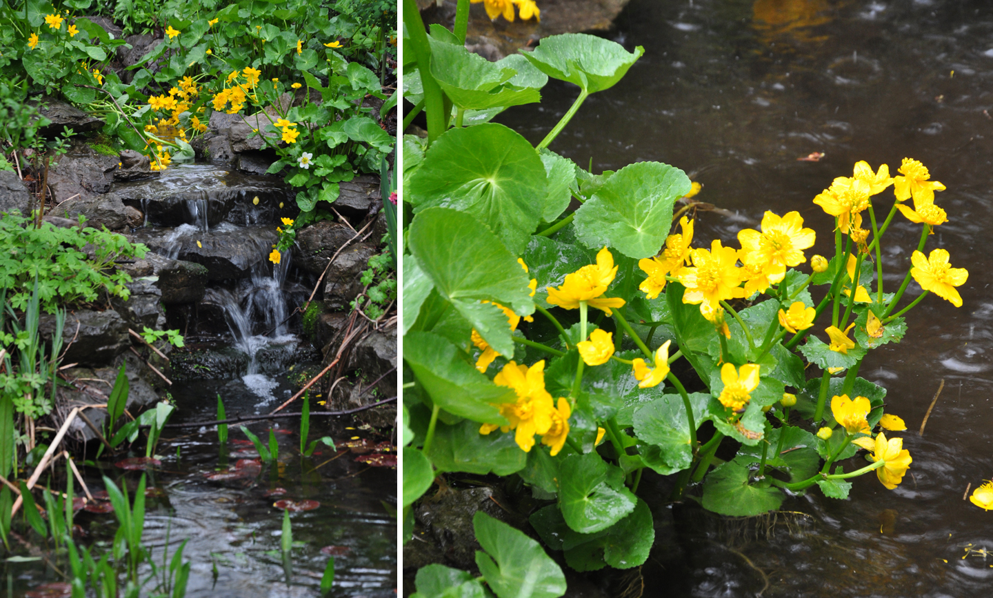 Above left: Water cascades down a waterfall into the pond. Above right: a yellow-colored Asian Marsh Marigold dips down into the water of the pond. Above: The bridge over the little stream that runs into the pond.