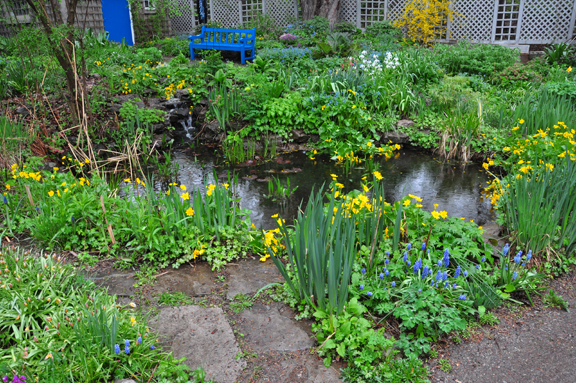 The vivid, blue wooden bench by the pond. You can see white Iris Bucharica in the lower left foreground and patches of blue Brunnera macrophylla and pink lungwort to the right of the bench.