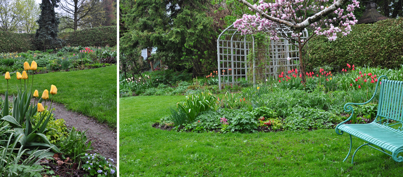 A gravel path leads past the house and through a wooden arch into the Perennial Garden. The path sweeps around the perimeter of the garden and leads you past the expansive perennial borders. Tulips and daffodils were planted throughout.