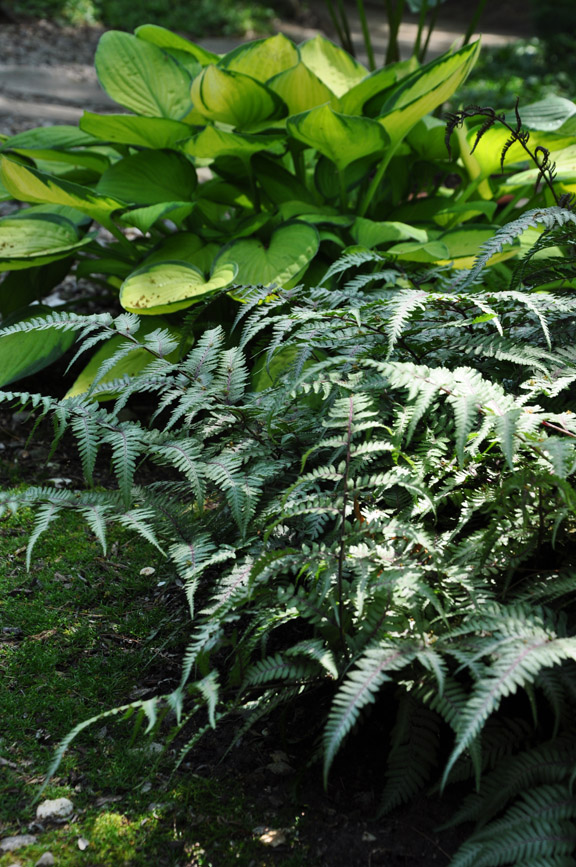 The interesting combination of a lime-coloured hosta and a Japanese Painted Fern