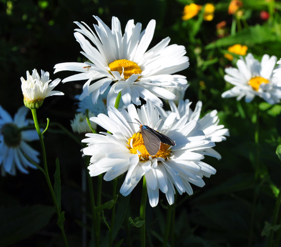 At the side of the house there are big white daisies...