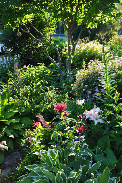 In the front garden, there is red Monarda with their crazy mop heads.