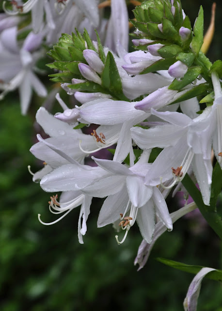 The hosta pictured here is easily the biggest perennial in the yard (about 3 feet in every direction). The blooms are huge and glisten with water droplets from yesterday's rainfall.