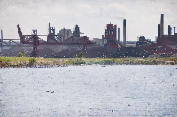 Hamilton is an industrial city, known for years as "Steel Town". Its deep harbour is notorious for its polluted waters. In recent years, the city has made efforts to clean up its reputation and its harbour, but as you can see from my pictures, the first view you get of the city as you cross the Skyway Bridge is still one of billowing smoke stakes and dark piles of coal.
