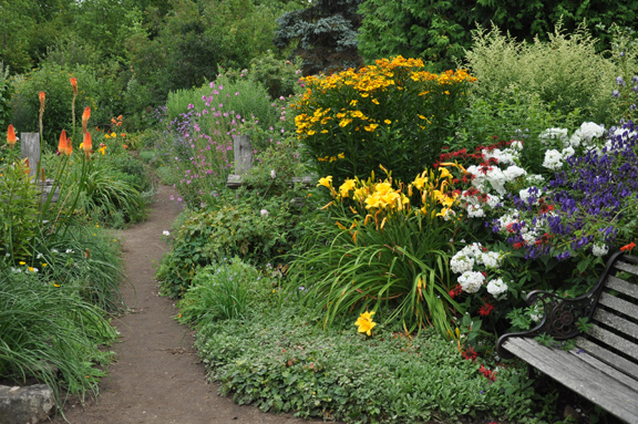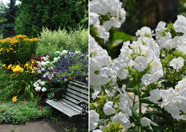 Just as you enter the garden, there is a garden bench. Behind it is a mixed planting that includes navy-colored Monkshood, Aconitum and white Phlox, Phlox paniculata 'David', yellow daylilies and tall yellow-orange Helenium.