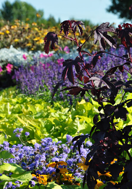 Looking at beds of annuals, I learned another thing too. A single plant in a large garden doesn't cut it. Annuals look best planted in drifts.