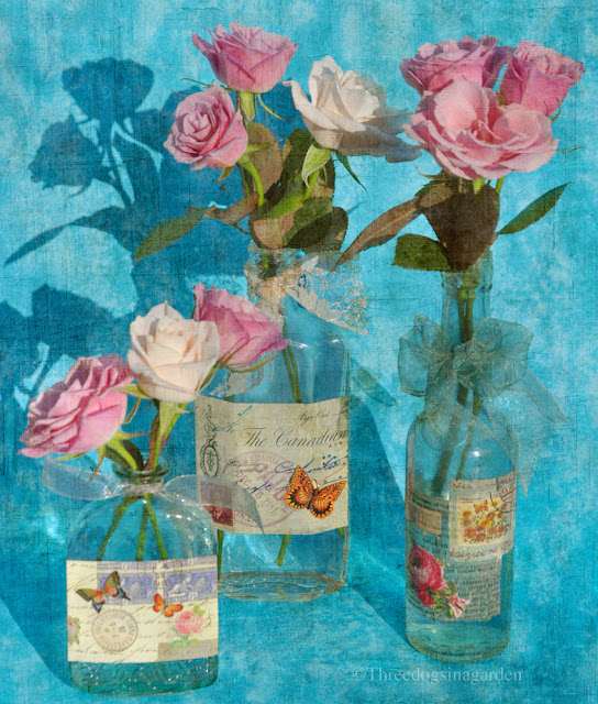 ReplyDeletelovely roses and I love the idea of decorating glass bottles this way very elegant