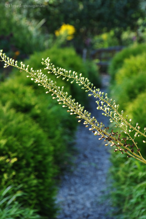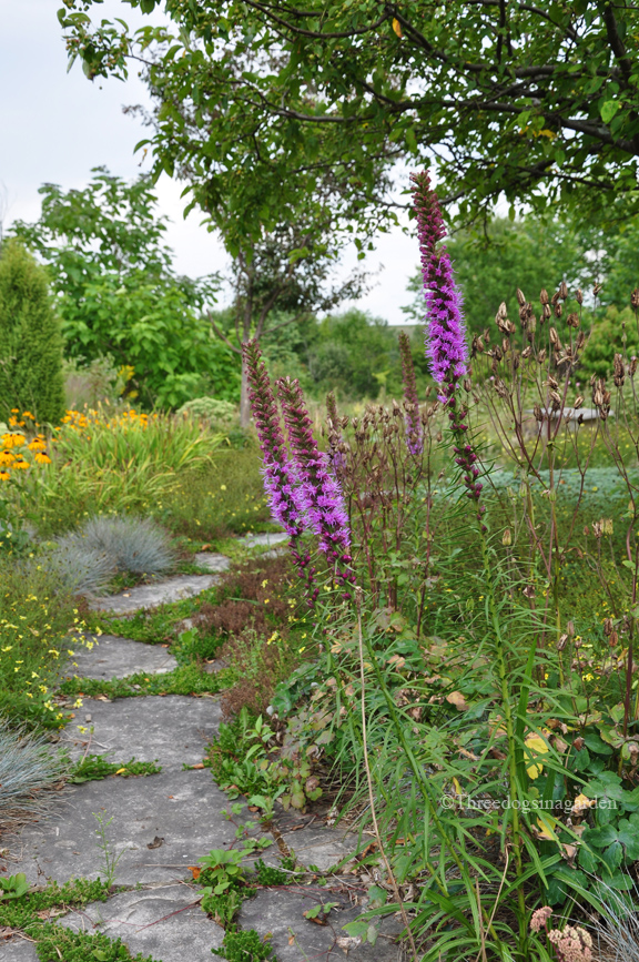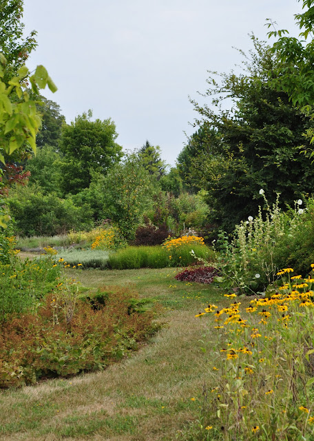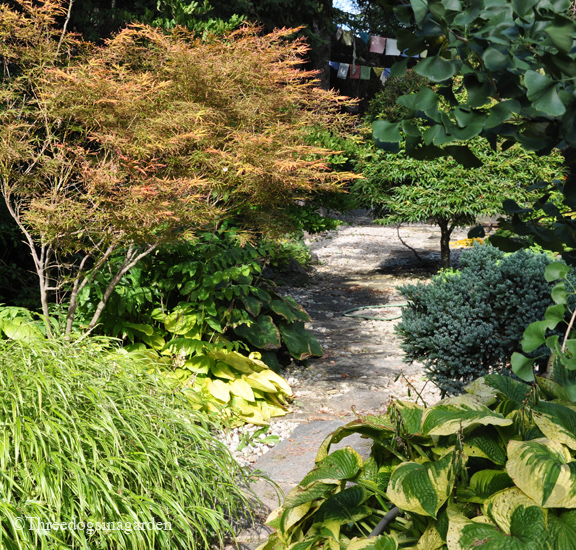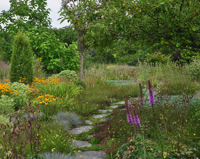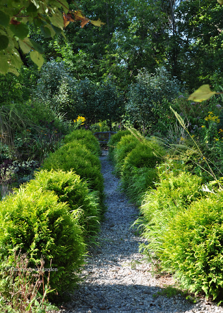 The beginning and end of this traditional allee is a classic urn. This focal point is accentuated with a circle of stonework. Brian Folmer's Garden near Walkerton, On.