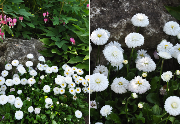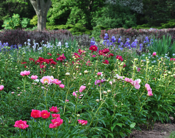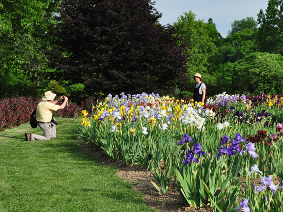I wanted to show you a few overall shots. Massed pink, white and red flowers were statement making. Note that in the first image, the blue and purple irises make a nice backdrop.