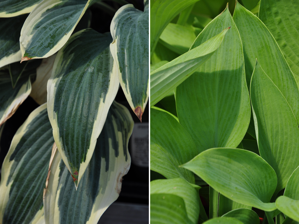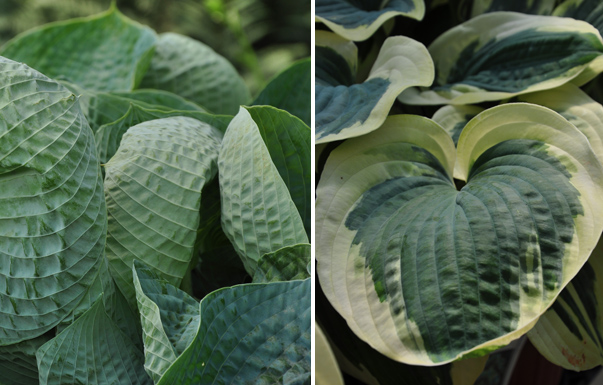 On the left: Hosta 'Love Pat' Whitish flowers and puckered blue-green leaves. Part shade to full sun. Height: 50 cm, Spread: 65 cm. On the right: Hosta 'Mount Tom' Intense blue-green leaves with white margins. Pale lavender flowers. Light to full shade. Height: 40-60cm Spread 70 cm.