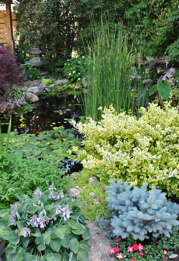 Here in the garden of Amber and Kevin Downes, a grey-green hosta has a nice color echo in the form of a blue-green evergreen. Their blue-grey foliage is emphasized even more by the golden colored leaves of the euonymus just behind them.