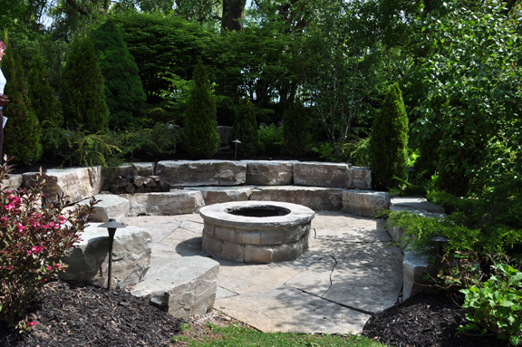 Once you release this design secret, recreating this area becomes doable. Create a semi-cirlce of shrubs and evergreens. Lay down a flagstone or pea gravel patio area in the center. Then, place some adirondack chairs in a semi-cicle around a store-bought fire pit.