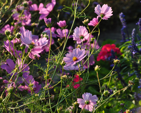 Annual pink cosmos and blue Salvia.