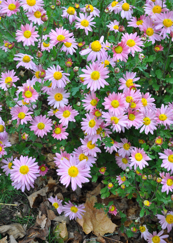 The plucky pink chrysanthemums are growing all along a chain link fence in another neighbour's yard.