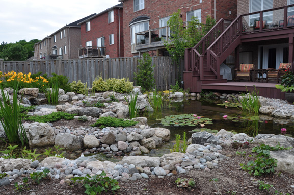 Talking with the homeowners, I think it was the sense of being at the cottage, without the long commute, that made them want to devote so much of their property to a pond. The sound of water tumbling down a waterfall also has a pleasant way of drowning out the local traffic noises.