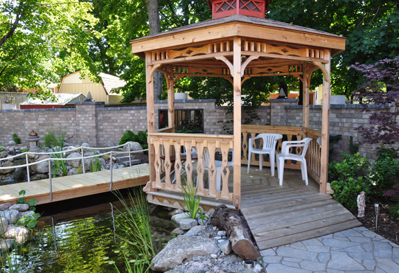 A flagstone path leads to a gazebo at one corner of the property. A gang plank leads from the gazebo out to a tiny island near the center of the pond.