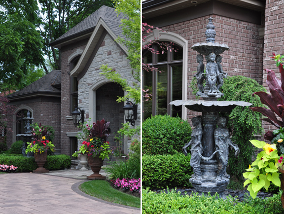 To the left of the front door, there is small courtyard of pea gravel. Two contemporary metal spheres make a nice counterpoint to the more traditional elements in this part of the garden.