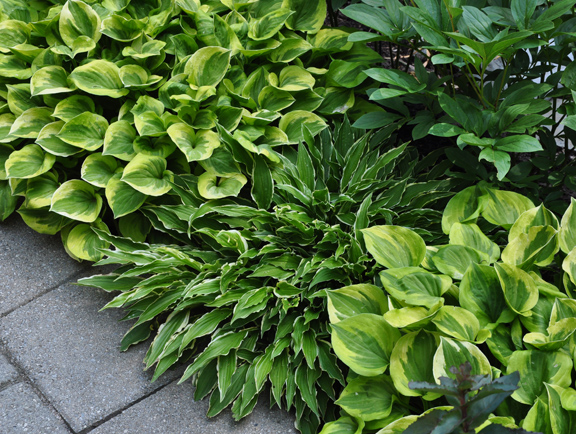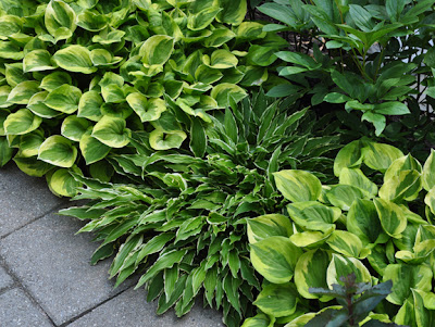 A closer look at the plantings that include a white rose, ivy, purple campanula, hosta,