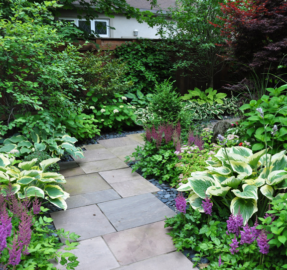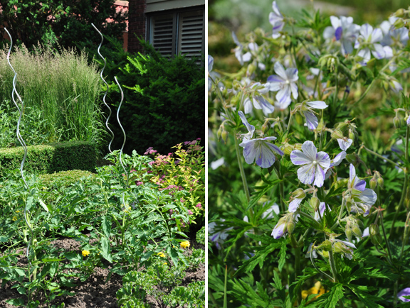 Plantings here include English yews, junipers, ferns, Lady's Mantle, and purple allium.