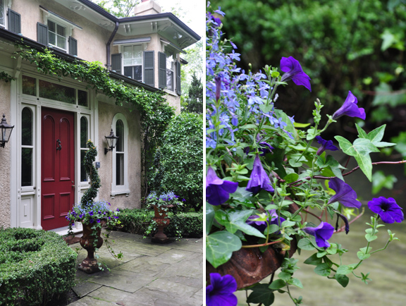 To the left of the front door, there is small courtyard of pea gravel. Two contemporary metal spheres make a nice counterpoint to the more traditional elements in this part of the garden.
