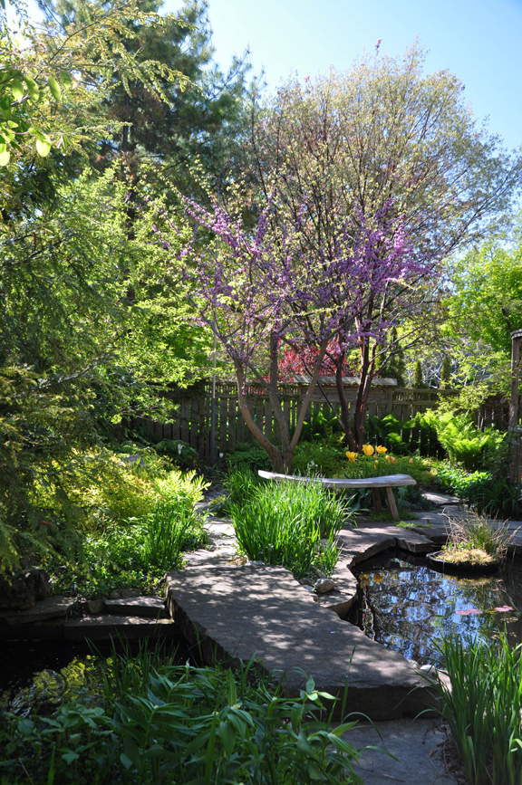 At the heart of the garden, there is a shallow pond with rustic bench under a Redbud covered in