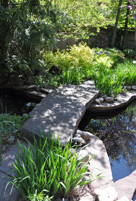 A stone bridge leads you across the pond.