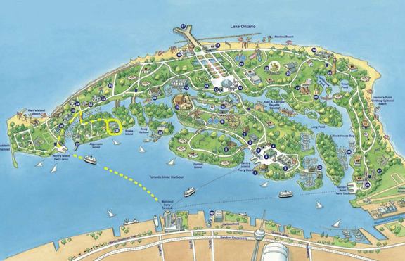 As you can see here on the map, there is a crescent-shaped cluster of islands just off-shore in the Toronto harbour.