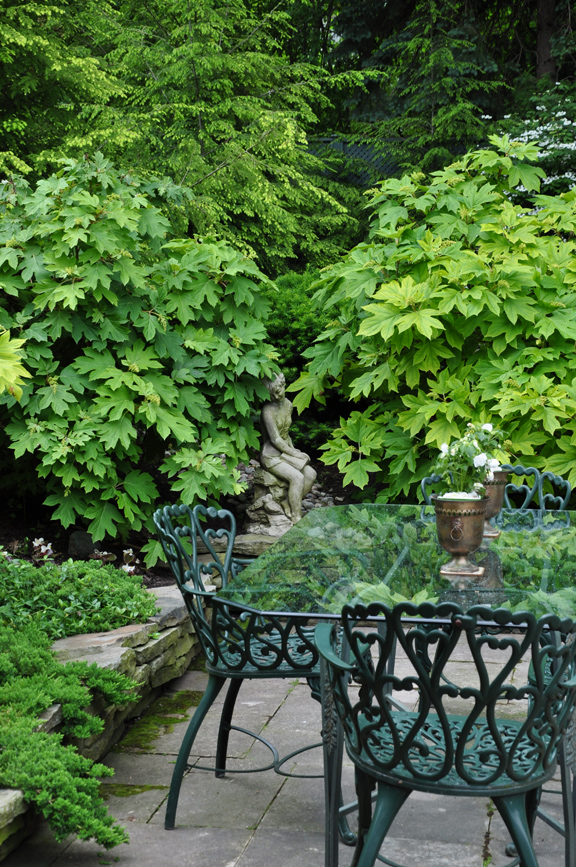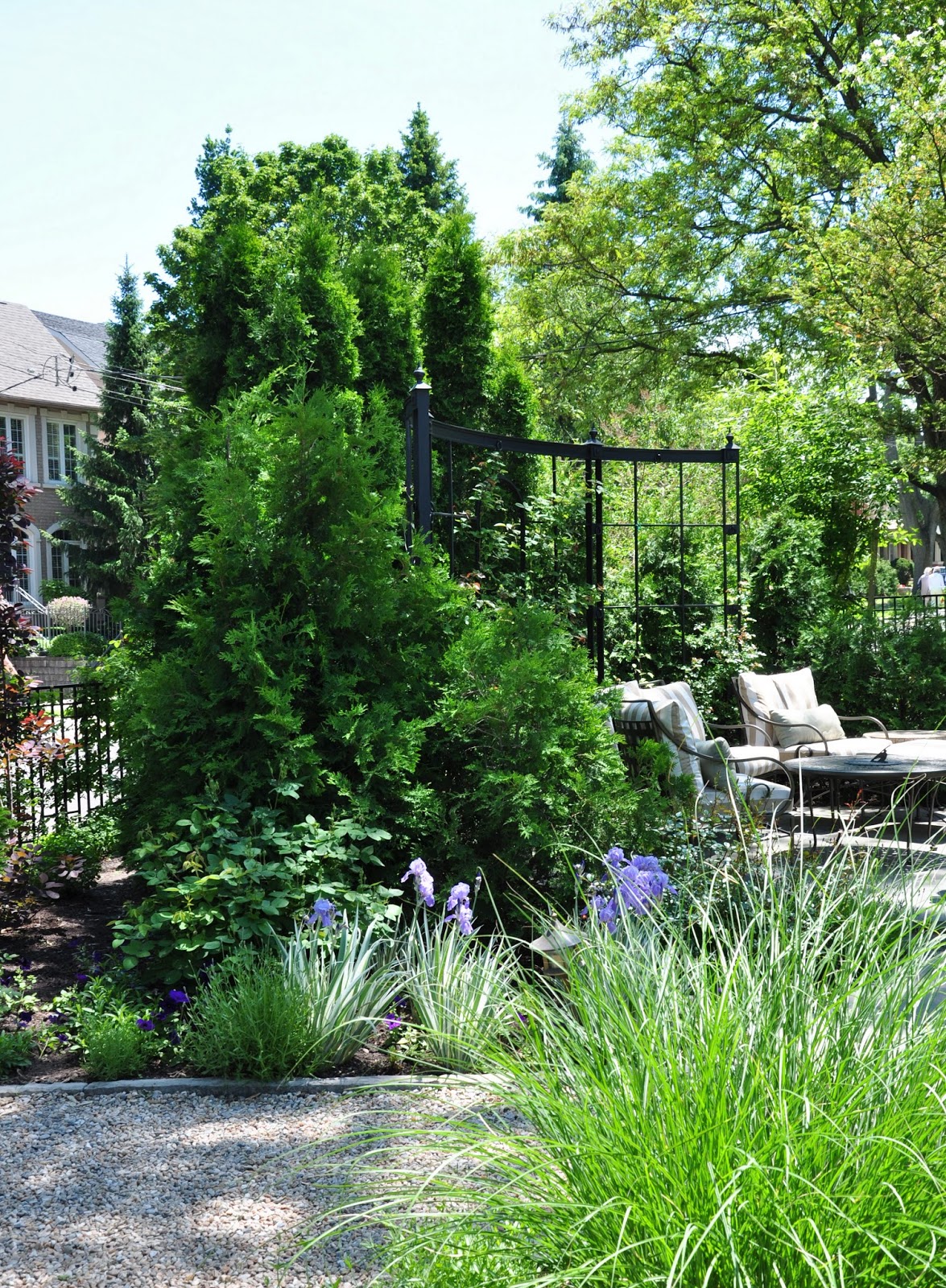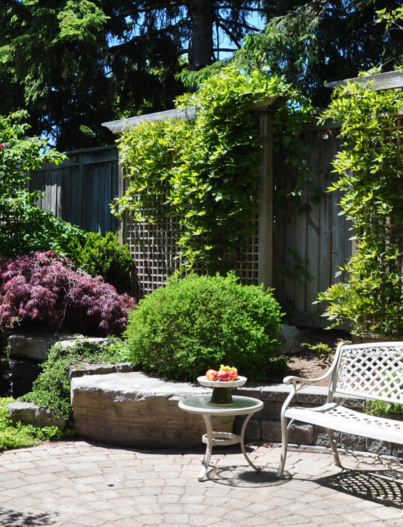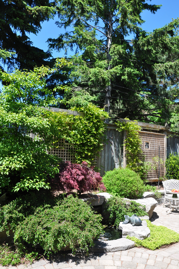 In this garden in the Forest Hill area of Toronto, there was nothing to block the view from the street. A wall of evergreens was planted then a decorative metal screen was added.