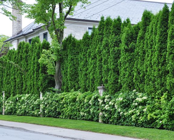 Climbing hydrangea obliterates the low fence, while a solid wall of cedars stretches up toward the home's roof line.