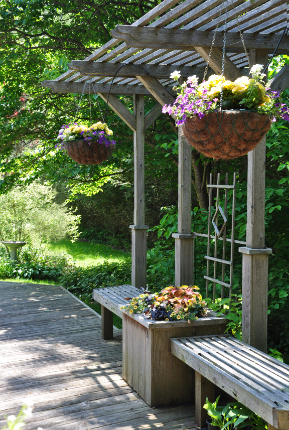 To keep this back deck area feeling secluded, a set of benches, a planter and an overhanging structure for vines and hanging baskets were added.