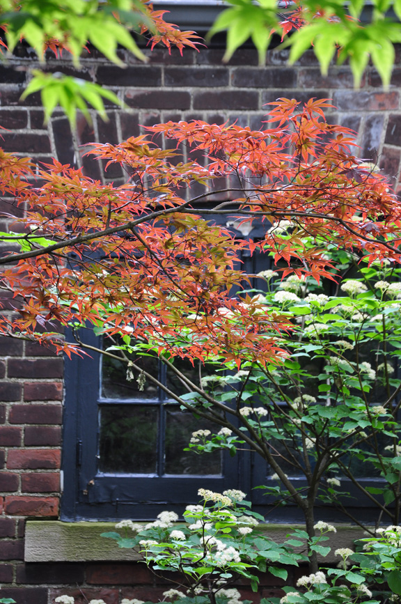 Other plantings like this Japanese Maple play off the colors of the brick house.