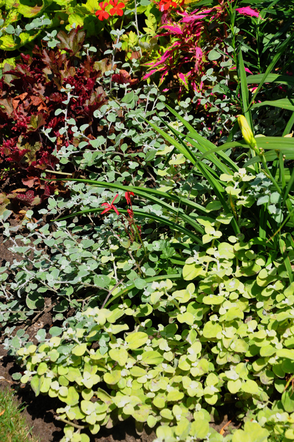 5. Don't think of annuals as just "flowers" or as plants you only use in pots. Here Patricia has planted two different varieties of Licorice plants as a groundcover at the front of her perennial border. They look great and are untouched by slugs.