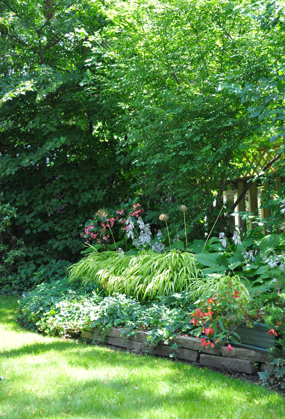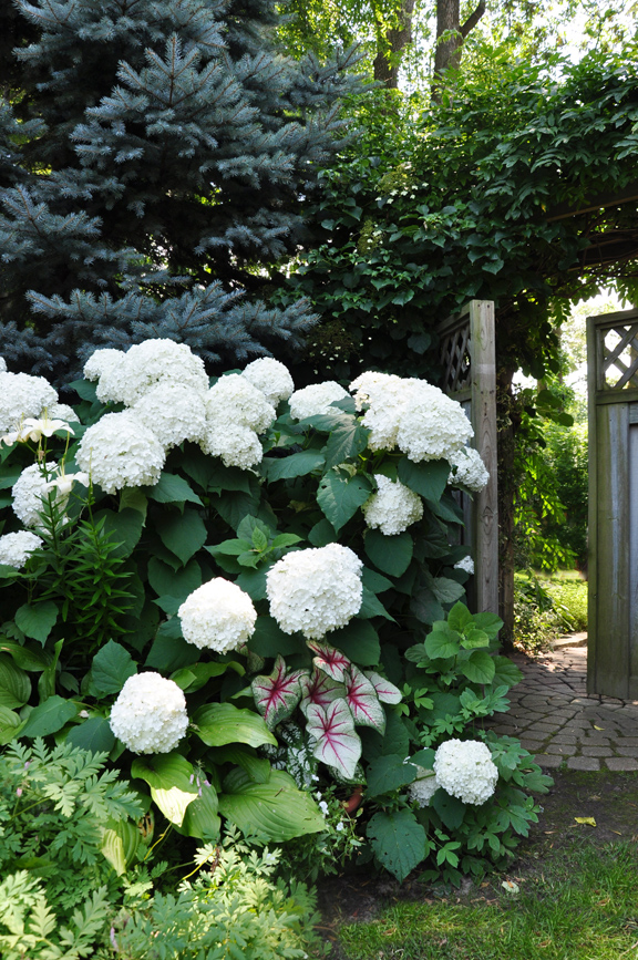 A pretty patch of Japanese Grass opposite the 'Annabelle' hydrangea.