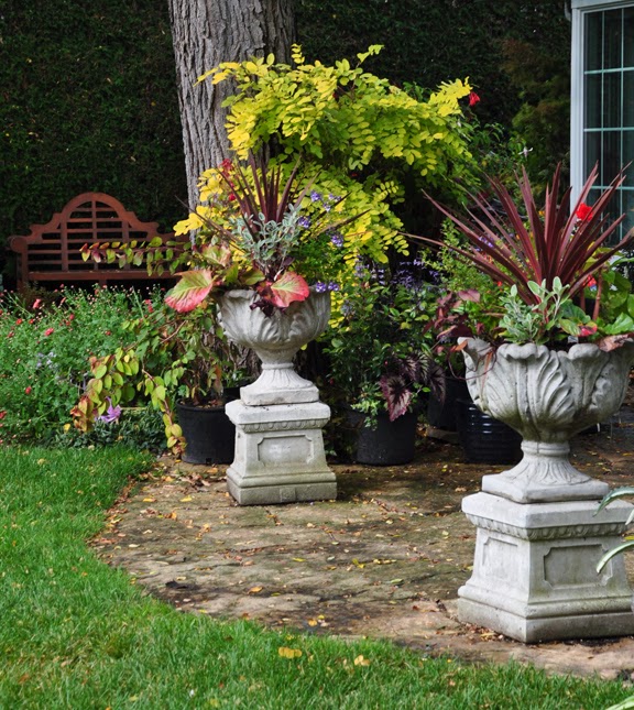 On the flag stone patio at the back her house, Marion has a pair of decorative urns and