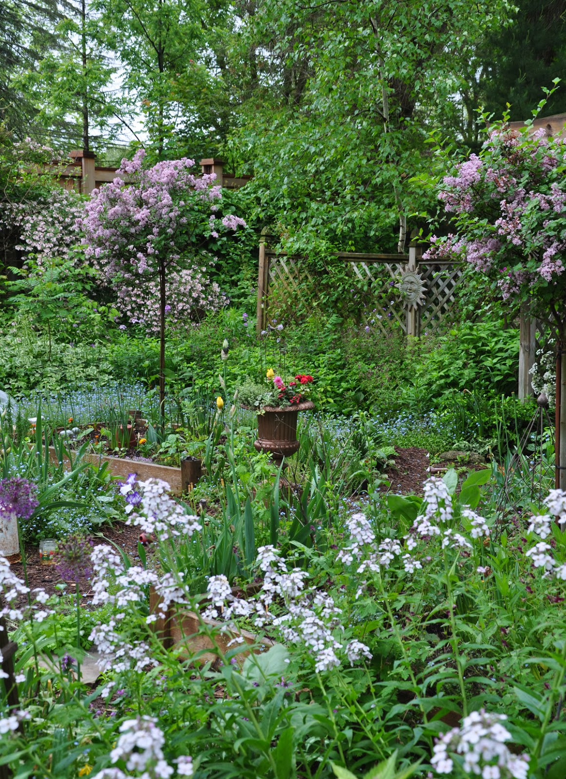 There are lilac standards in the centre of two of the flowerbeds diagonally opposite from one another and...