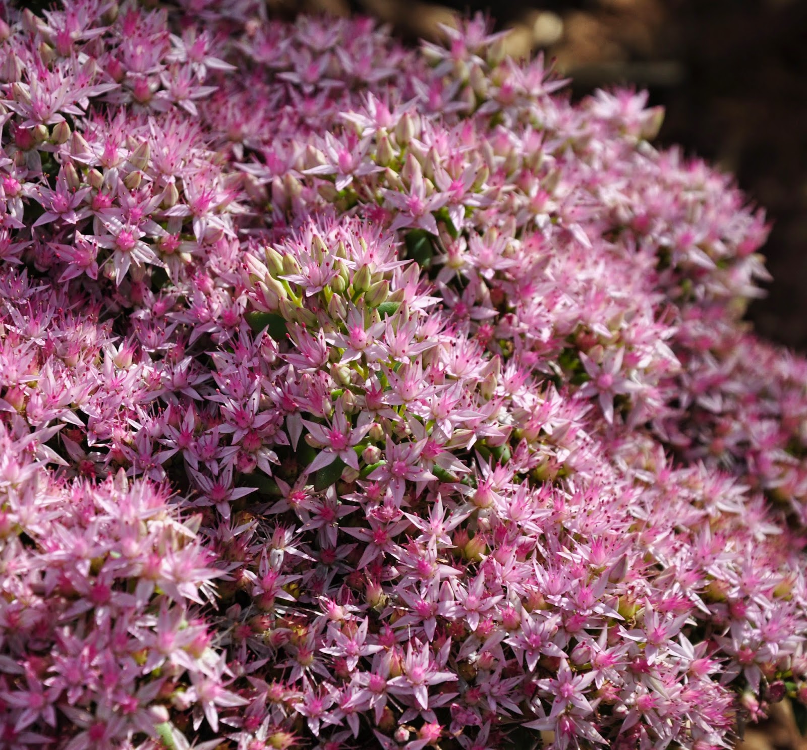 Sedum 'Pure Joy': has a low, rounded mound of blue-green foliage and pale pink flowers. Grow it in poor to average well-drained soil. Full sun. Height: 20-30 cm (10-12 inches) Spread: 45-50 cm (18-20 inches). USDA Zones: 4-9.